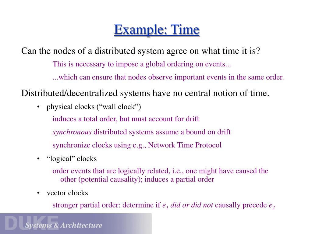 Example: Time • Can the nodes of a distributed system agree on what time it is? • This is necessary to impose a global ordering on events... • ...which can ensure that nodes observe important events in the same order. • Distributed/decentralized systems have no central notion of time. • physical clocks (“wall clock”) • induces a total order, but must account for drift • synchronous distributed systems assume a bound on drift • synchronize clocks using e.g., Network Time Protocol • “logical” clocks • order events that are logically related, i.e., one might have caused the other (potential causality); induces a partial order • vector clocks • stronger partial order: determine if e1did or did not causally precede e2