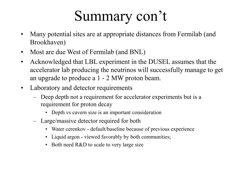 Summary con’t • Many potential sites are at appropriate distances from Fermilab (and Brookhaven) • Most are due West of Fermilab (and BNL) • Acknowledged that LBL experiment in the DUSEL assumes that the accelerator lab producing the neutrinos will successfully manage to get an upgrade to produce a 1 - 2 MW proton beam. • Laboratory and detector requirements • Deep depth not a requirement for accelerator experiments but is a requirement for proton decay • Depth vs cavern size is an important consideration • Large/massive detector required for both • Water cerenkov - default/baseline because of previous experience • Liquid argon - viewed favorably by both communities; • Both need R&D to scale to very large size