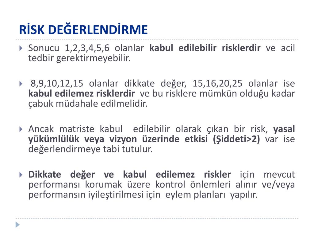 RİSK DEĞERLENDİRME • Sonucu 1,2,3,4,5,6 olanlar kabul edilebilir risklerdir ve acil tedbir gerektirmeyebilir. • 8,9,10,12,15 olanlar dikkate değer, 15,16,20,25 olanlar ise kabul edilemez risklerdir ve bu risklere mümkün olduğu kadar çabuk müdahale edilmelidir. • Ancak matriste kabul edilebilir olarak çıkan bir risk, yasal yükümlülük veya vizyon üzerinde etkisi (Şiddeti>2) var ise değerlendirmeye tabi tutulur. • Dikkate değer ve kabul edilemez riskler için mevcut performansı korumak üzere kontrol önlemleri alınır ve/veya performansın iyileştirilmesi için eylem planları yapılır.