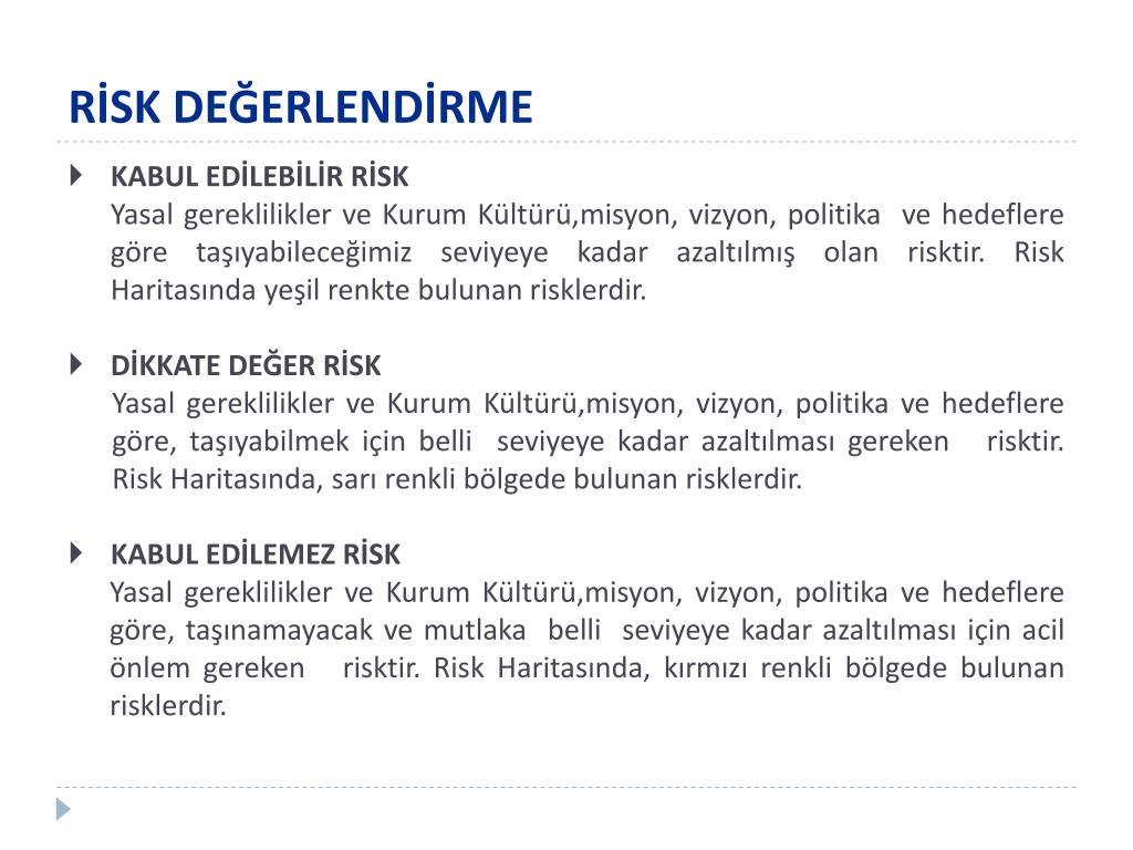 RİSK DEĞERLENDİRME • KABUL EDİLEBİLİR RİSK Yasal gereklilikler ve Kurum Kültürü,misyon, vizyon, politika ve hedeflere göre taşıyabileceğimiz seviyeye kadar azaltılmış olan risktir. Risk Haritasında yeşil renkte bulunan risklerdir. • DİKKATE DEĞER RİSK Yasal gereklilikler ve Kurum Kültürü,misyon, vizyon, politika ve hedeflere göre, taşıyabilmek için belli seviyeye kadar azaltılması gereken risktir. Risk Haritasında, sarı renkli bölgede bulunan risklerdir. • KABUL EDİLEMEZ RİSK Yasal gereklilikler ve Kurum Kültürü,misyon, vizyon, politika ve hedeflere göre, taşınamayacak ve mutlaka belli seviyeye kadar azaltılması için acil önlem gereken risktir. Risk Haritasında, kırmızı renkli bölgede bulunan risklerdir.