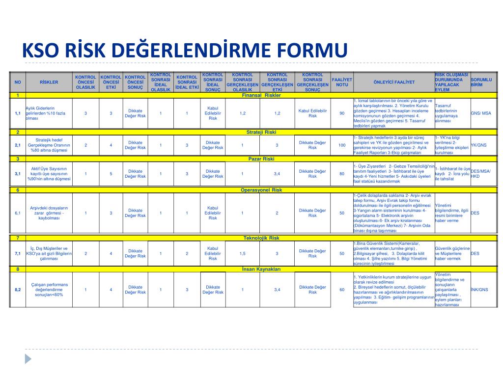 RİSK KATEGORİLERİ Finansal Riskler Finansal Olmayan Riskler • Nakit Para • Banka • Aidat gelirleri • Hizmet gelirleri • Oda Binası ve demirbaşlar • Strateji Riski • Pazar Riski • İmaj Riski • İnsan Kaynakları Riski • Yasal Risk • Teknolojik Risk • Operasyonel Risk