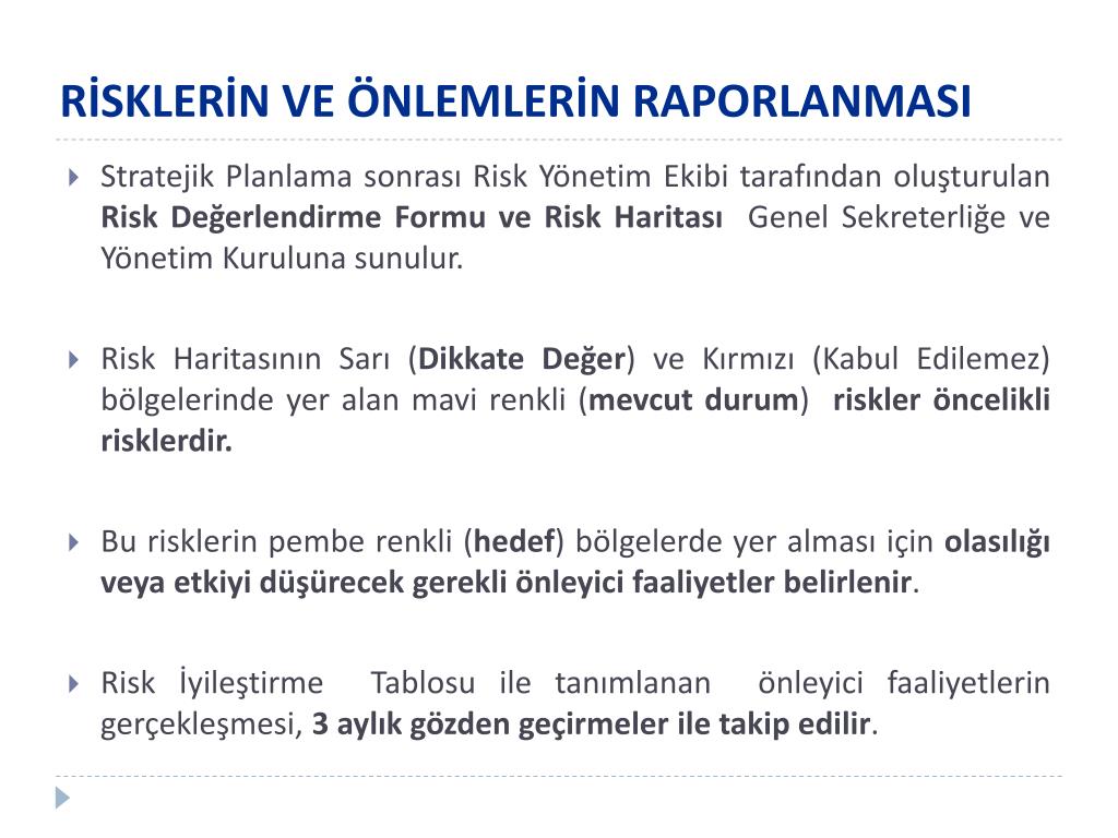 RİSKLERİN VE ÖNLEMLERİN RAPORLANMASI • Stratejik Planlama sonrası Risk Yönetim Ekibi tarafından oluşturulan Risk Değerlendirme Formu ve Risk Haritası Genel Sekreterliğe ve Yönetim Kuruluna sunulur. • Risk Haritasının Sarı (Dikkate Değer) ve Kırmızı (Kabul Edilemez) bölgelerinde yer alan mavi renkli (mevcut durum) riskler öncelikli risklerdir. • Bu risklerin pembe renkli (hedef) bölgelerde yer alması için olasılığı veya etkiyi düşürecek gerekli önleyici faaliyetler belirlenir. • Risk İyileştirme Tablosu ile tanımlanan önleyici faaliyetlerin gerçekleşmesi, 3 aylık gözden geçirmeler ile takip edilir.