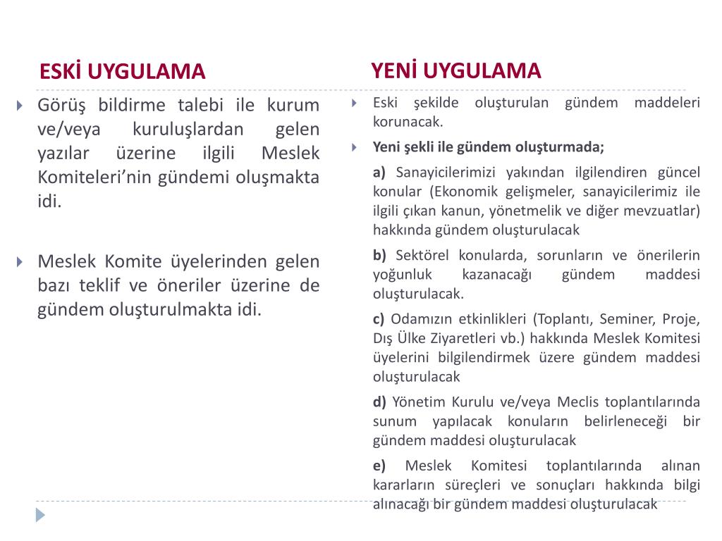 ESKİ UYGULAMA YENİ UYGULAMA • Görüş bildirme talebi ile kurum ve/veya kuruluşlardan gelen yazılar üzerine ilgili Meslek Komiteleri’nin gündemi oluşmakta idi. • Meslek Komite üyelerinden gelen bazı teklif ve öneriler üzerine de gündem oluşturulmakta idi. • Eski şekilde oluşturulan gündem maddeleri korunacak. • Yeni şekli ile gündem oluşturmada; a) Sanayicilerimizi yakından ilgilendiren güncel konular (Ekonomik gelişmeler, sanayicilerimiz ile ilgili çıkan kanun, yönetmelik ve diğer mevzuatlar) hakkında gündem oluşturulacak b) Sektörel konularda, sorunların ve önerilerin yoğunluk kazanacağı gündem maddesi oluşturulacak. c) Odamızın etkinlikleri (Toplantı, Seminer, Proje, Dış Ülke Ziyaretleri vb.) hakkında Meslek Komitesi üyelerini bilgilendirmek üzere gündem maddesi oluşturulacak d) Yönetim Kurulu ve/veya Meclis toplantılarında sunum yapılacak konuların belirleneceği bir gündem maddesi oluşturulacak e) Meslek Komitesi toplantılarında alınan kararların süreçleri ve sonuçları hakkında bilgi alınacağı bir gündem maddesi oluşturulacak