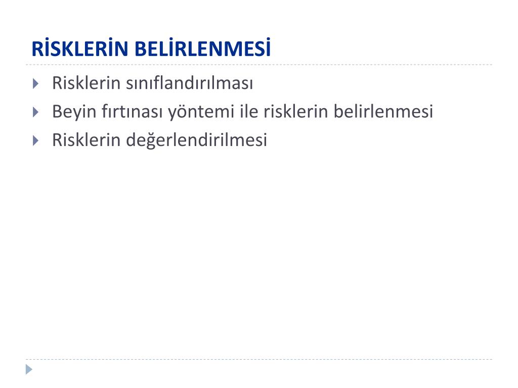 RİSKLERİN BELİRLENMESİ • Risklerin sınıflandırılması • Beyin fırtınası yöntemi ile risklerin belirlenmesi • Risklerin değerlendirilmesi