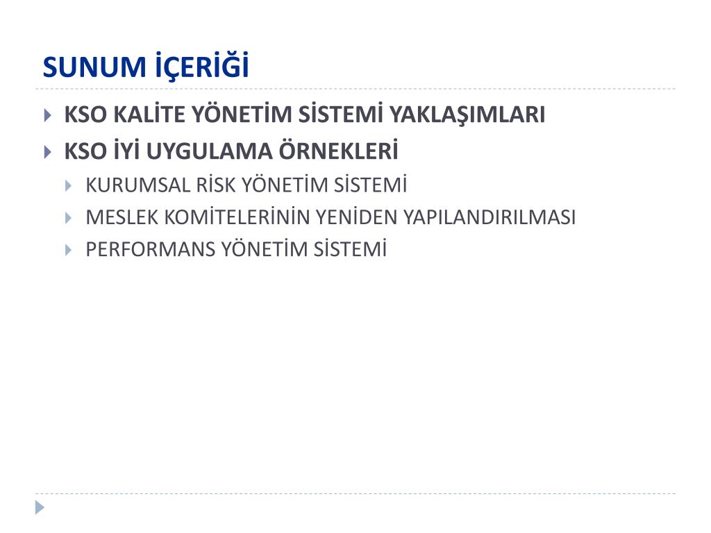 SUNUM İÇERİĞİ • KSO KALİTE YÖNETİM SİSTEMİ YAKLAŞIMLARI • KSO İYİ UYGULAMA ÖRNEKLERİ • KURUMSAL RİSK YÖNETİM SİSTEMİ • MESLEK KOMİTELERİNİN YENİDEN YAPILANDIRILMASI • PERFORMANS YÖNETİM SİSTEMİ