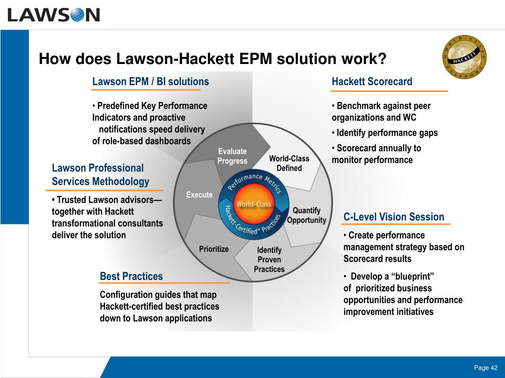 Lawson EPM / BI solutions • Predefined Key PerformanceIndicators and proactive notifications speed delivery of role-based dashboards • Hackett Scorecard • Benchmark against peer organizations and WC • Identify performance gaps • Scorecard annually to monitor performance Best Practices Configuration guides that map Hackett-certified best practices down to Lawson applications How does Lawson-Hackett EPM solution work? EvaluateProgress World-ClassDefined Lawson Professional Services Methodology • Trusted Lawson advisors— together with Hackett transformational consultants deliver the solution Execute QuantifyOpportunity • C-Level Vision Session • Create performance management strategy based on Scorecard results • Develop a “blueprint” of prioritized business opportunities and performance improvement initiatives Prioritize Identify ProvenPractices