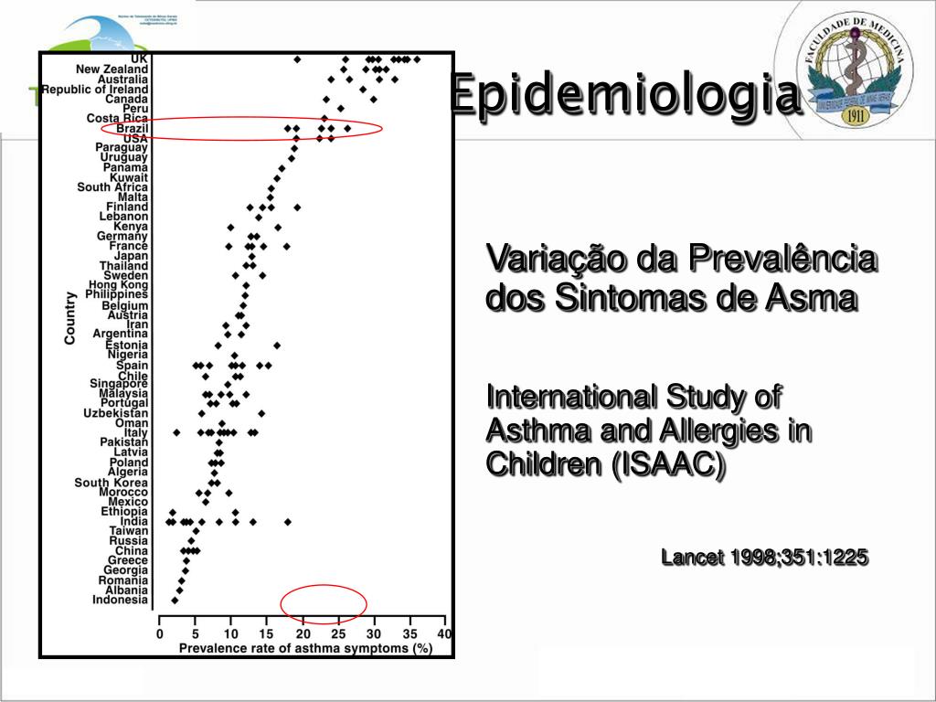 Epidemiologia Variação da Prevalência dos Sintomas de Asma International Study of Asthma and Allergies in Children (ISAAC) Lancet1998;351:1225