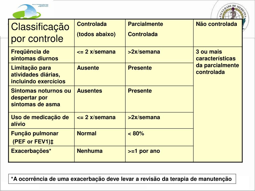 Terapia de manutenção Objetivos: • Reduzir freqüência e intensidade dos sintomas • Melhorar a função pulmonar • Reduzir uso de corticóide oral (>4 cursos por ano = fraturas) • Reduzir morbidade e mortalidade • Melhorar a qualidade de vida “Um médico deve ter três objetivos reais: aliviar o sofrimento, reduzir a gravidade da doença e reconhecer e se abster de tratar o intratável.”