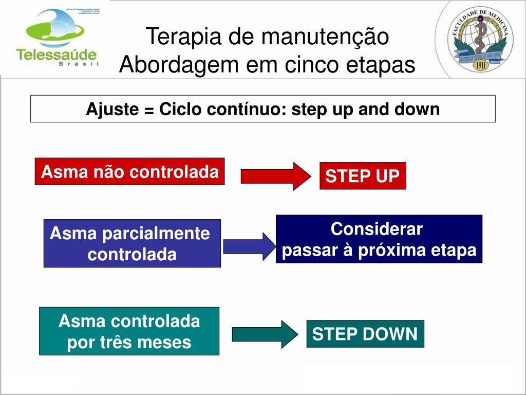 Terapia de manutenção Abordagem em cinco etapas Ajuste = Ciclo contínuo: step up and down Asma não controlada STEP UP Considerar passar à próxima etapa Asma parcialmente controlada Asma controlada por três meses STEP DOWN