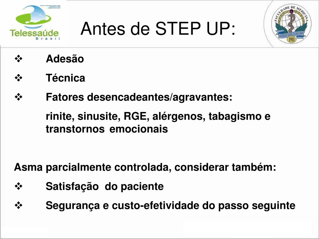 Antes de STEP UP: • Adesão • Técnica • Fatores desencadeantes/agravantes: • rinite, sinusite, RGE, alérgenos, tabagismo e transtornos emocionais • Asma parcialmente controlada, considerar também: • Satisfação do paciente • Segurança e custo-efetividade do passo seguinte