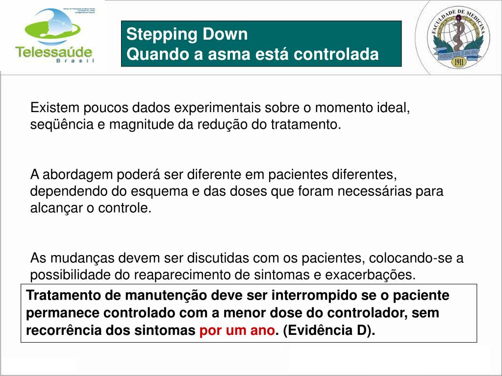 Stepping Down Quando a asma está controlada Existem poucos dados experimentais sobre o momento ideal, seqüência e magnitude da redução do tratamento. A abordagem poderá ser diferente em pacientes diferentes, dependendo do esquema e das doses que foram necessárias para alcançar o controle. As mudanças devem ser discutidas com os pacientes, colocando-se a possibilidade do reaparecimento de sintomas e exacerbações. Tratamento de manutenção deve ser interrompido se o paciente permanece controlado com a menor dose do controlador, sem recorrência dos sintomas por um ano. (Evidência D).