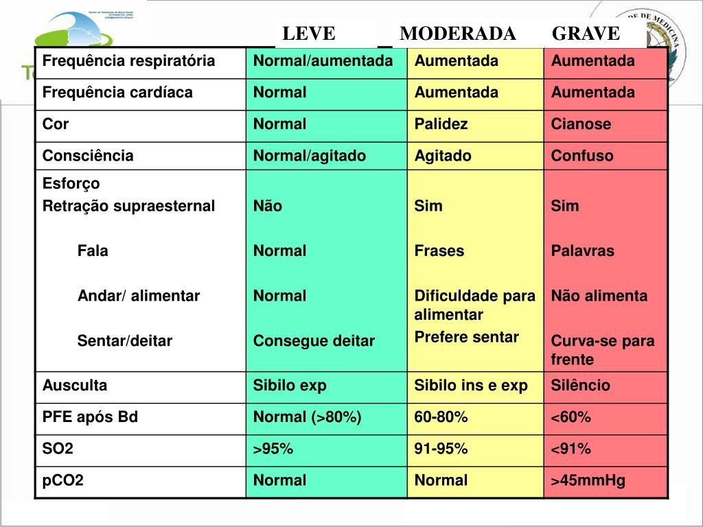 Passo 1 Salbutamol 2 a 4 puffs, 20/20 minutos, Repetir até 3x (1 hora) Se respondeu bem e sustenta a resposta ALTA: Salbutamol 2 a 4 puffs, 3/3h ou 4/4 h “as needed” Ideal para alta PFE > 60 %