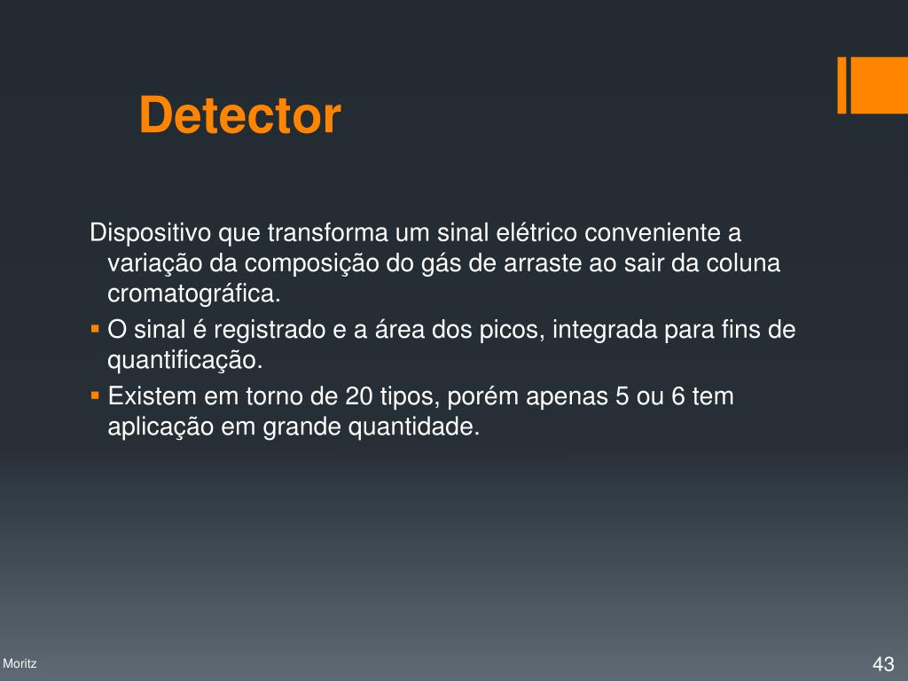Detector Dispositivo que transforma um sinal elétrico conveniente a variação da composição do gás de arraste ao sair da coluna cromatográfica. O sinal é registrado e a área dos picos, integrada para fins de quantificação. Existem em torno de 20 tipos, porém apenas 5 ou 6 tem aplicação em grande quantidade. Profa. Denise Moritz