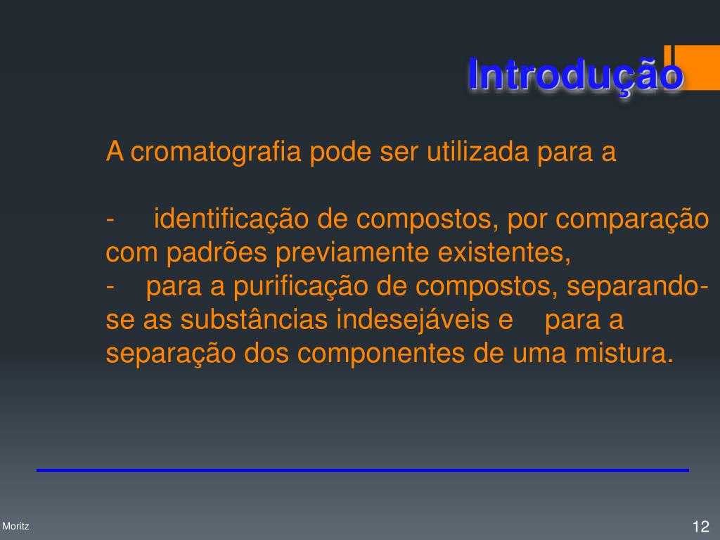 A cromatografia pode ser utilizada para a- identificação de compostos, por comparação com padrões previamente existentes, - para a purificação de compostos, separando-se as substâncias indesejáveis e para a separação dos componentes de uma mistura. Introdução Profa. Denise Moritz