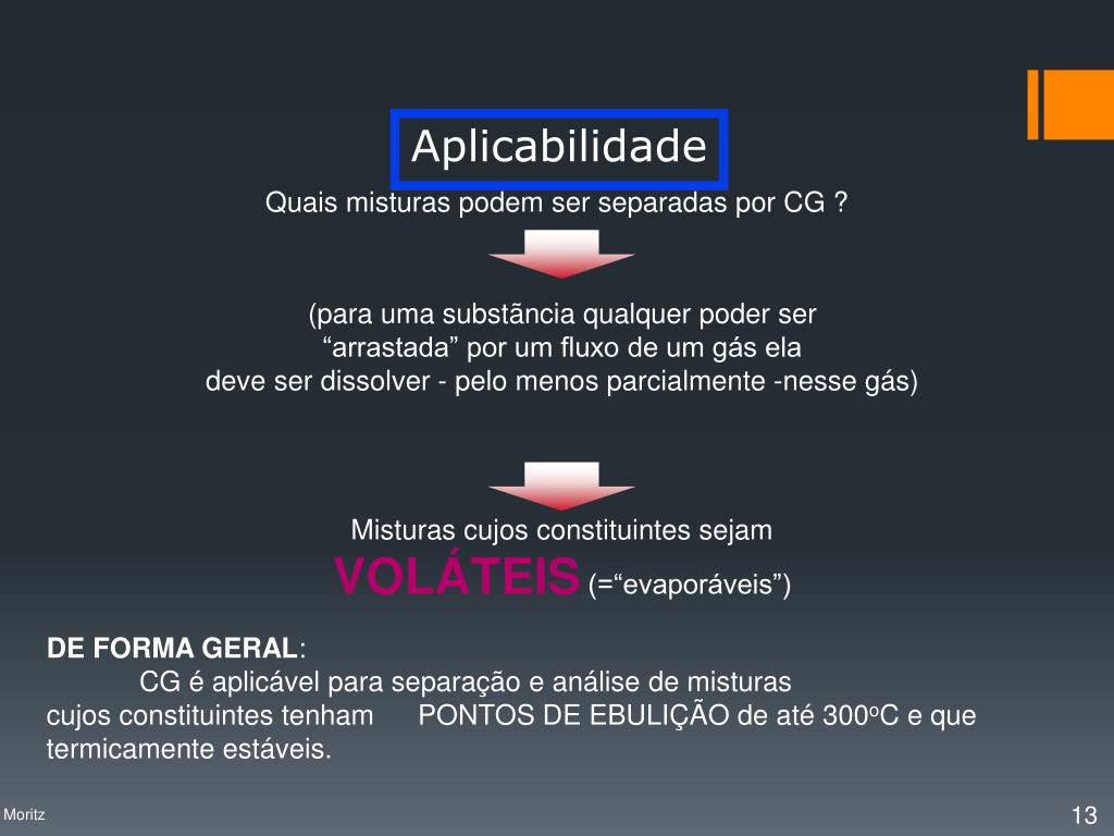 Aplicabilidade Quais misturas podem ser separadas por CG ? (para uma substãncia qualquer poder ser “arrastada” por um fluxo de um gás ela deve ser dissolver - pelo menos parcialmente -nesse gás) Misturas cujos constituintes sejam VOLÁTEIS (=“evaporáveis”) DE FORMA GERAL: CG é aplicável para separação e análisede misturas cujos constituintes tenham PONTOS DE EBULIÇÃO de até 300oCe que termicamente estáveis. Profa. Denise Moritz