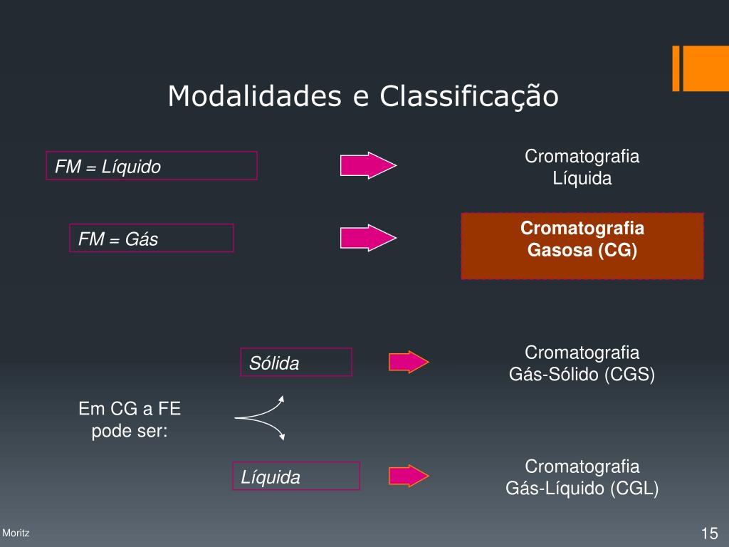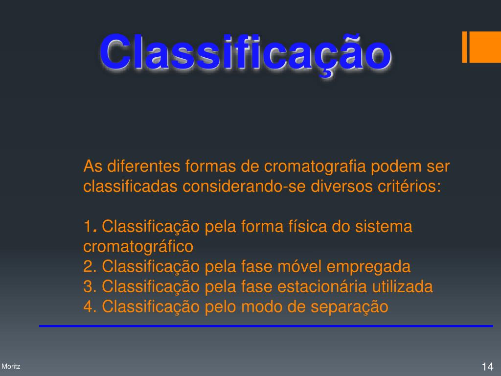 As diferentes formas de cromatografia podem ser classificadas considerando-se diversos critérios:1. Classificação pela forma física do sistema cromatográfico2. Classificação pela fase móvel empregada3. Classificação pela fase estacionária utilizada4. Classificação pelo modo de separação Classificação Profa. Denise Moritz