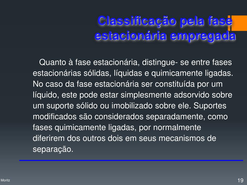 Quanto à fase estacionária, distingue- se entre fases estacionárias sólidas, líquidas e quimicamente ligadas. No caso da fase estacionária ser constituída por um líquido, este pode estar simplesmente adsorvido sobre um suporte sólido ou imobilizado sobre ele. Suportes modificados são considerados separadamente, como fases quimicamente ligadas, por normalmente diferirem dos outros dois em seus mecanismos de separação. Classificação pela fase estacionária empregada Profa. Denise Moritz