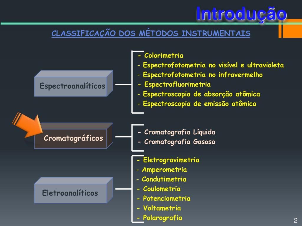 CROMATOGRAFIA GASOSA. Introdução . CLASSIFICAÇÃO DOS MÉTODOS INSTRUMENTAIS. - Colorimetria Espectrofotometria no visível e ultravioleta Espectrofotometria no infravermelho - Espectrofluorimetria Espectroscopia de absorção atômica Espectroscopia de emissão atômica.