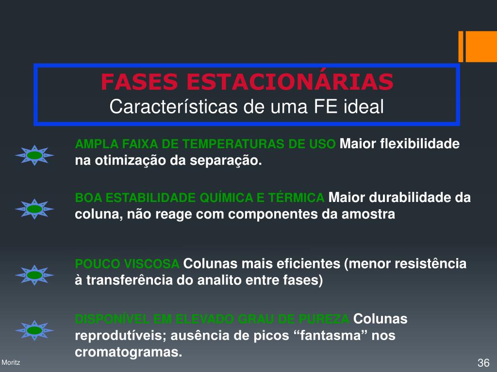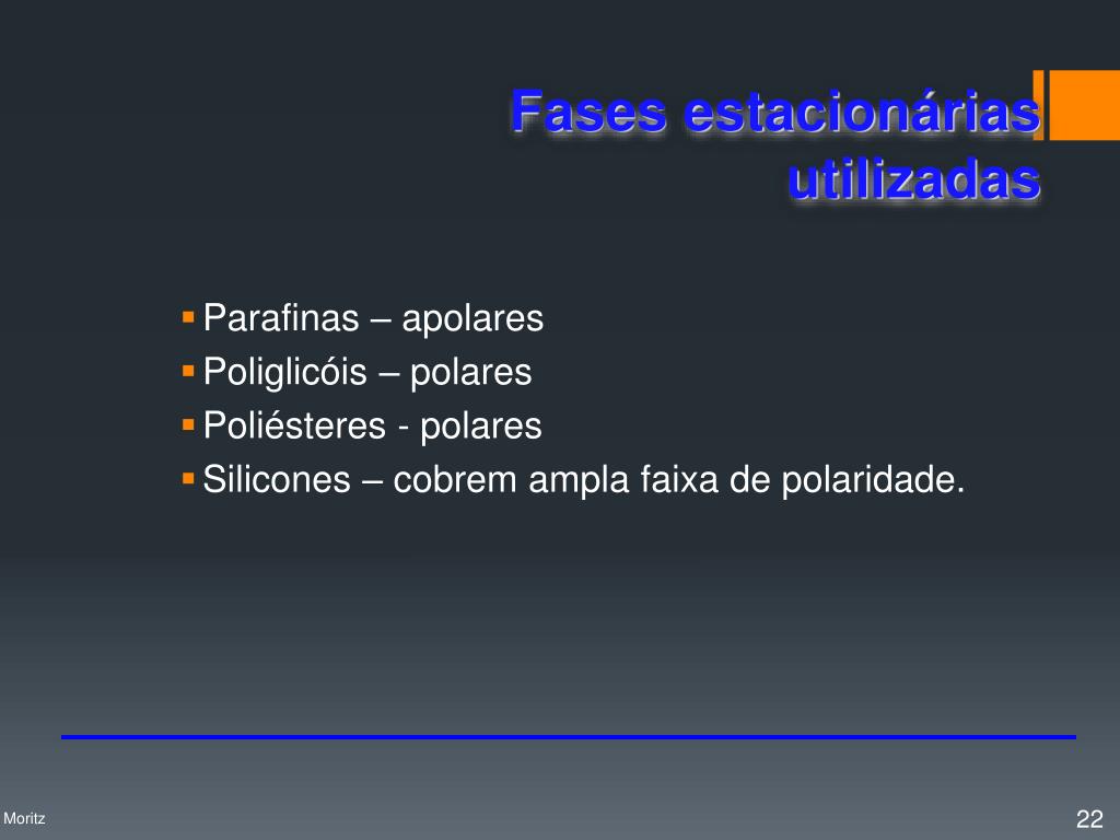 AMPLA FAIXA DE TEMPERATURAS DE USOMaior flexibilidade na otimização da separação. BOA ESTABILIDADE QUÍMICA E TÉRMICAMaior durabilidade da coluna, não reage com componentes da amostra POUCO VISCOSAColunas mais eficientes (menor resistência à transferência do analito entre fases) DISPONÍVEL EM ELEVADO GRAU DE PUREZAColunas reprodutíveis; ausência de picos “fantasma” nos cromatogramas. FASES ESTACIONÁRIAS Características de uma FE ideal Profa. Denise Moritz