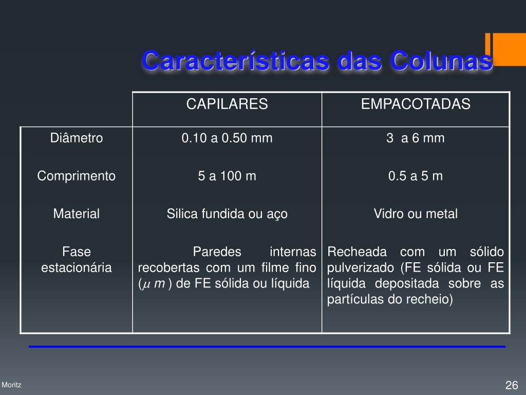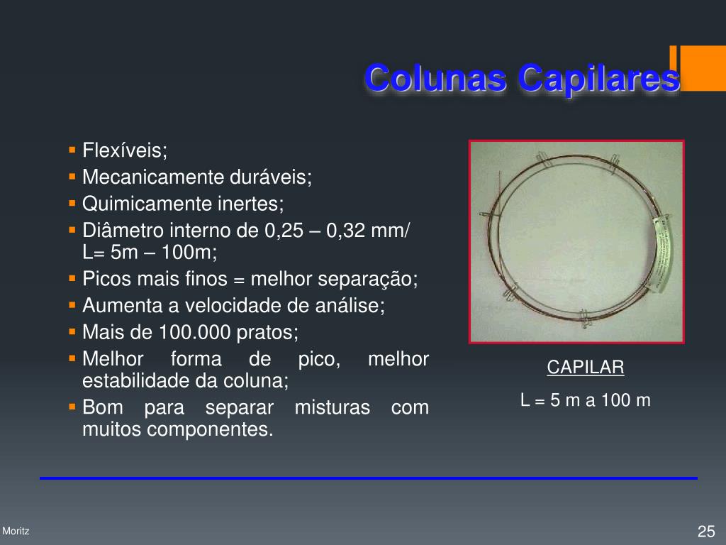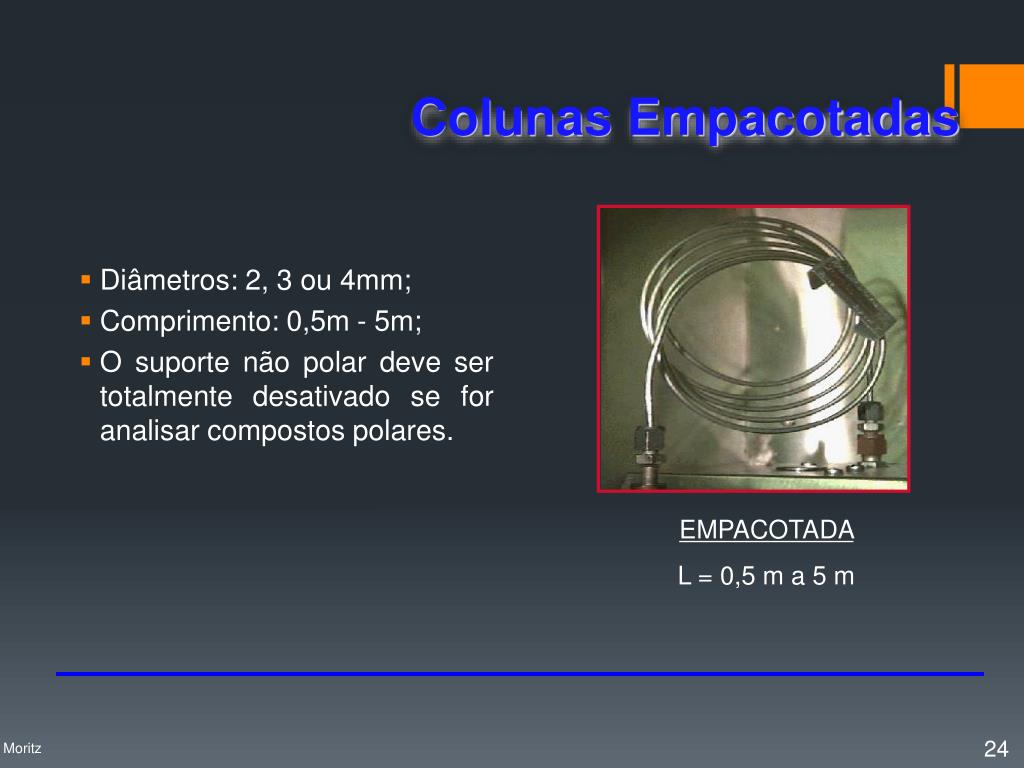 Colunas Empacotadas • Diâmetros: 2, 3 ou 4mm; • Comprimento: 0,5m - 5m; • O suporte não polar deve ser totalmente desativado se for analisar compostos polares. EMPACOTADA L = 0,5 m a 5 m Profa. Denise Moritz
