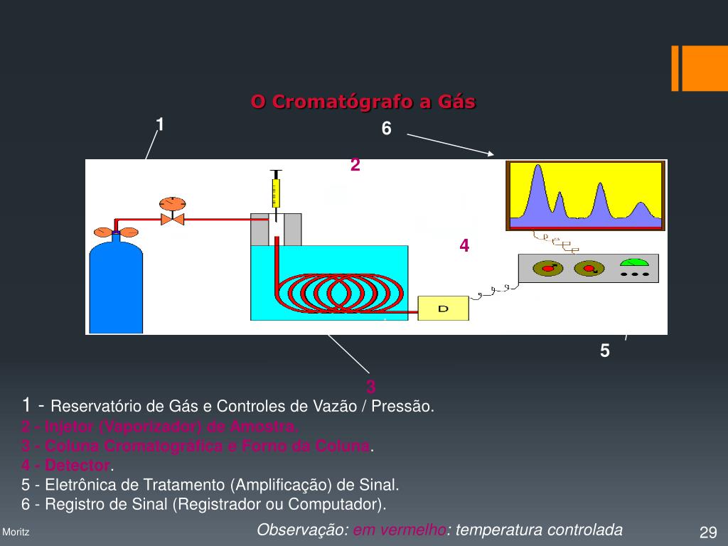 1 6 2 4 5 3 O Cromatógrafo a Gás 1 - Reservatório de Gás e Controles de Vazão / Pressão. 2 - Injetor (Vaporizador) de Amostra. 3 - Coluna Cromatográfica e Forno da Coluna. 4 - Detector. 5 - Eletrônica de Tratamento (Amplificação) de Sinal. 6 - Registro de Sinal (Registrador ou Computador). Observação: em vermelho: temperatura controlada Profa. Denise Moritz