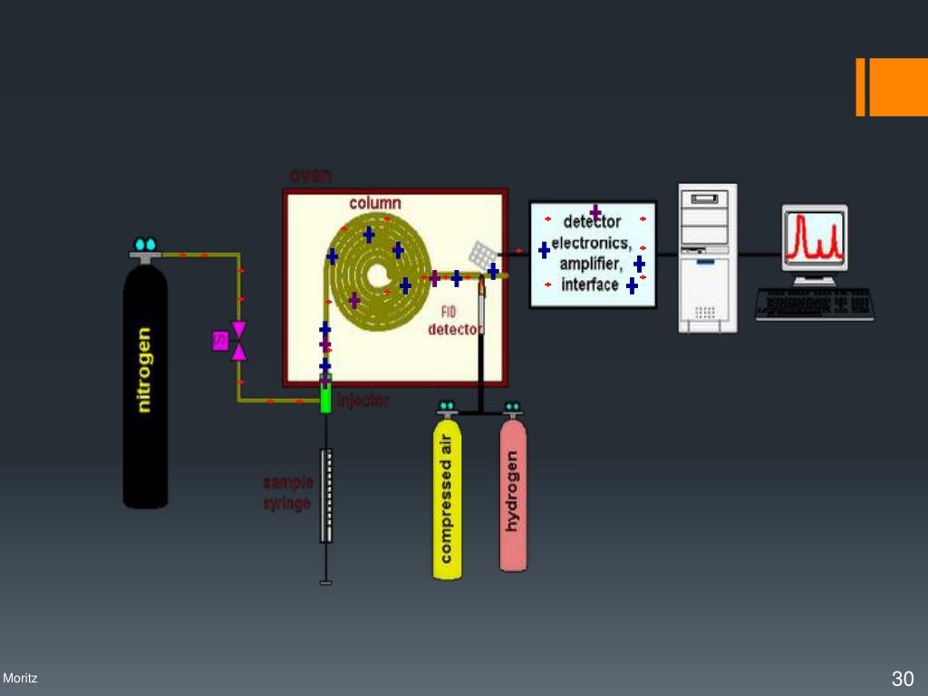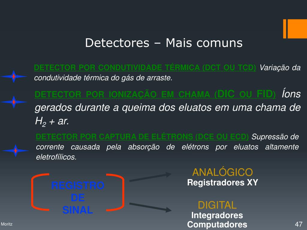 DETECTOR POR CONDUTIVIDADE TÉRMICA (DCT OU TCD)Variação da condutividade térmica do gás de arraste. DETECTOR POR IONIZAÇÃO EM CHAMA (DIC OU FID)Íons gerados durante a queima dos eluatos em uma chama de H2 + ar. DETECTOR POR CAPTURA DE ELÉTRONS (DCE OU ECD)Supressão de corrente causada pela absorção de elétrons por eluatos altamente eletrofílicos. ANALÓGICO Registradores XY REGISTRO DE SINAL DIGITAL Integradores Computadores Detectores – Mais comuns Profa. Denise Moritz