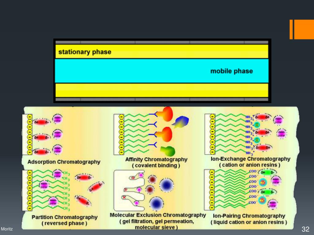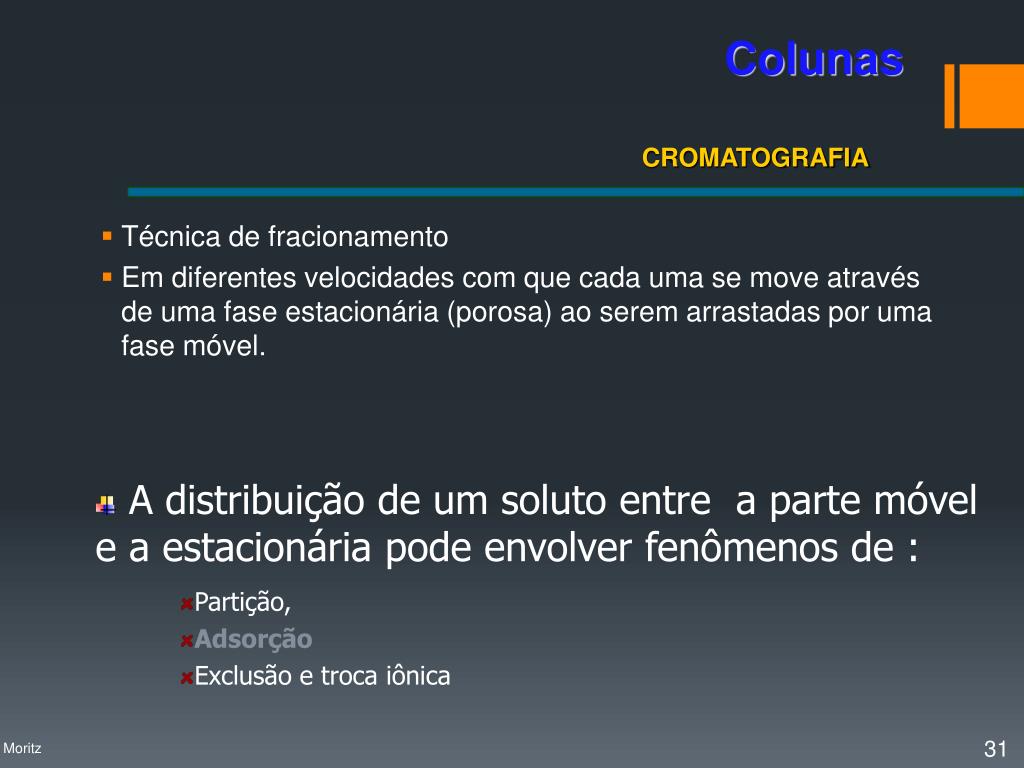 A cromatografia envolve uma série de processos de separação de misturas, acontece pela passagem de uma mistura através de duas fases: uma estacionária (fixa) e outra móvel. A interação dos componentes da mistura com estas duas fases é influenciado por diferentes forças intermoleculares, incluindo iônica, bipolar, apolar, e específicos efeitos de afinidade e solubilidade. Introdução Profa. Denise Moritz