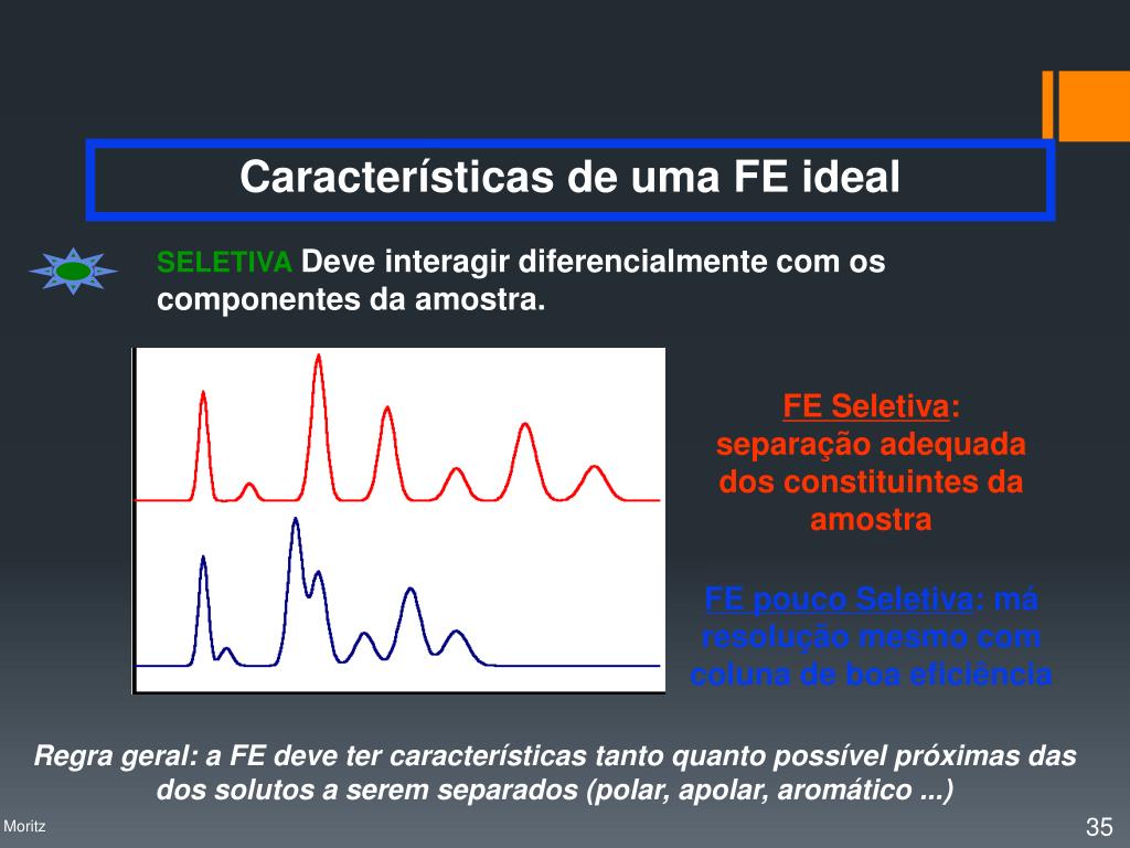SELETIVADeve interagir diferencialmente com os componentes da amostra. FE Seletiva: separação adequada dos constituintes da amostra FE pouco Seletiva: má resolução mesmo com coluna de boa eficiência Características de uma FE ideal Regra geral: a FE deve ter características tanto quanto possível próximas das dos solutos a serem separados (polar, apolar, aromático ...) Profa. Denise Moritz