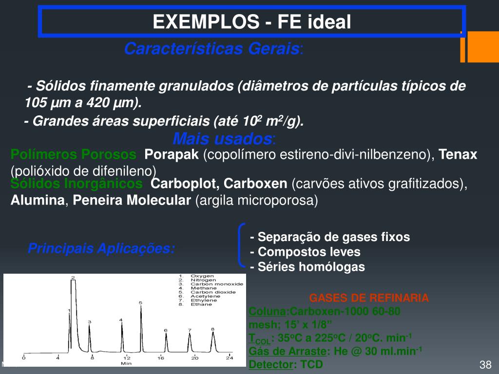 - Sólidos finamente granulados (diâmetros de partículas típicos de 105 µm a 420 µm). - Grandes áreas superficiais (até 102 m2/g). - Separação de gases fixos - Compostos leves - Séries homólogas Principais Aplicações: EXEMPLOS - FE ideal Características Gerais: Mais usados: Polímeros Porosos Porapak (copolímero estireno-divi-nilbenzeno), Tenax (polióxido de difenileno) Sólidos Inorgânicos Carboplot, Carboxen (carvões ativos grafitizados), Alumina, Peneira Molecular (argila microporosa) GASES DE REFINARIA Coluna:Carboxen-1000 60-80 mesh; 15’ x 1/8” TCOL: 35oC a 225oC / 20oC. min-1 Gás de Arraste: He @ 30 ml.min-1 Detector: TCD Profa. Denise Moritz