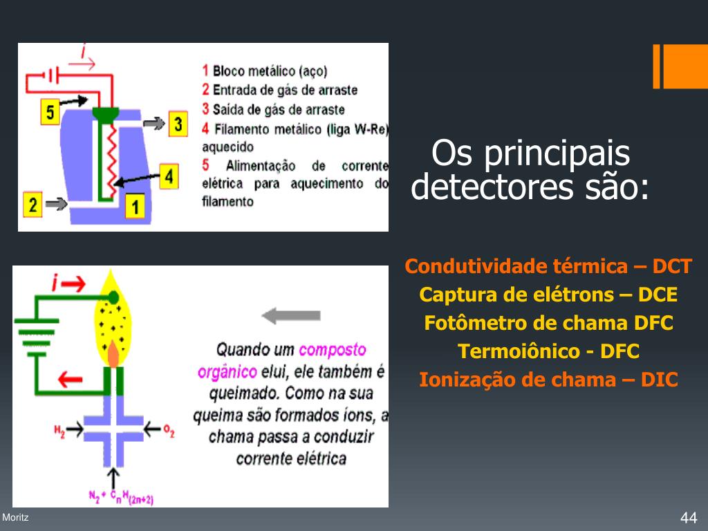 Osprincipaisdetectoressão: Condutividadetérmica – DCT Captura de elétrons – DCE Fotômetro de chama DFC Termoiônico - DFC Ionização de chama – DIC Profa. Denise Moritz