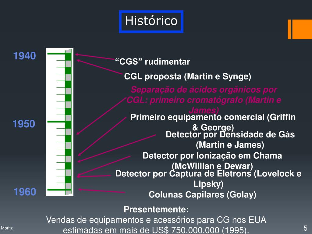 1940 1950 1960 Histórico “CGS” rudimentar CGL proposta (Martin e Synge) Separação de ácidos orgânicos por CGL: primeiro cromatógrafo (Martin e James) Primeiro equipamento comercial (Griffin & George) Detector por Densidade de Gás (Martin e James) Detector por Ionização em Chama (McWillian e Dewar) Detector por Captura de Eletrons (Lovelock e Lipsky) Colunas Capilares (Golay) Presentemente: Vendas de equipamentos e acessórios para CG nos EUA estimadas em mais de US$ 750.000.000 (1995). Profa. Denise Moritz