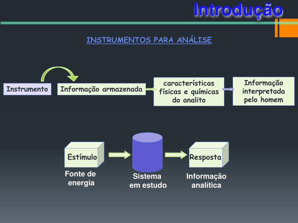 Introdução INSTRUMENTOS PARA ANÁLISE Informação interpretada pelo homem características físicas e químicas do analito Instrumento Informação armazenada Estímulo Resposta Fonte de energia Sistema em estudo Informação analítica
