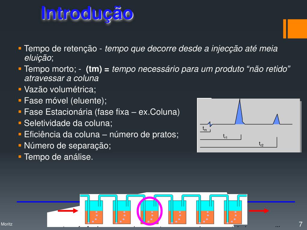 tR = Tempo de Retenção (tempo decorrido entre a in-jeção e o ápice do pico cromatográfico) Introdução Tempo de Retenção Ajustado, tR‘ O parâmetro diretamente mensurável de retenção de um analito é o TEMPO DE RETENÇÃO AJUSTADO, tR’: SINAL TEMPO Profa. Denise Moritz