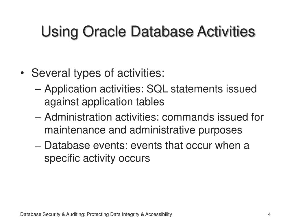Using Oracle Database Activities • Several types of activities: • Application activities: SQL statements issued against application tables • Administration activities: commands issued for maintenance and administrative purposes • Database events: events that occur when a specific activity occurs Database Security & Auditing: Protecting Data Integrity & Accessibility