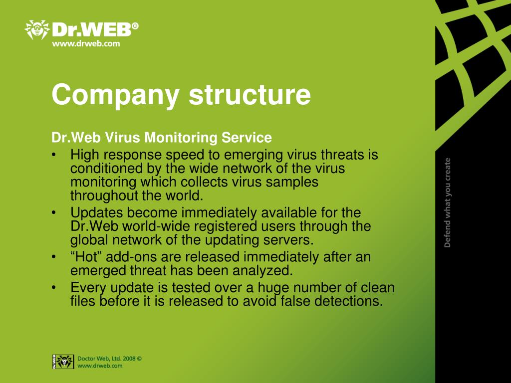 Company structure Dr.Web Virus Monitoring Service • High response speed to emerging virus threats is conditioned by the wide network of the virus monitoring which collects virus samplesthroughout the world. • Updates become immediately available for the Dr.Web world-wide registered users through the global network of the updating servers. • “Hot” add-ons are released immediately after an emerged threat has been analyzed. • Every update is tested over a huge number of clean files before it is released to avoid false detections.