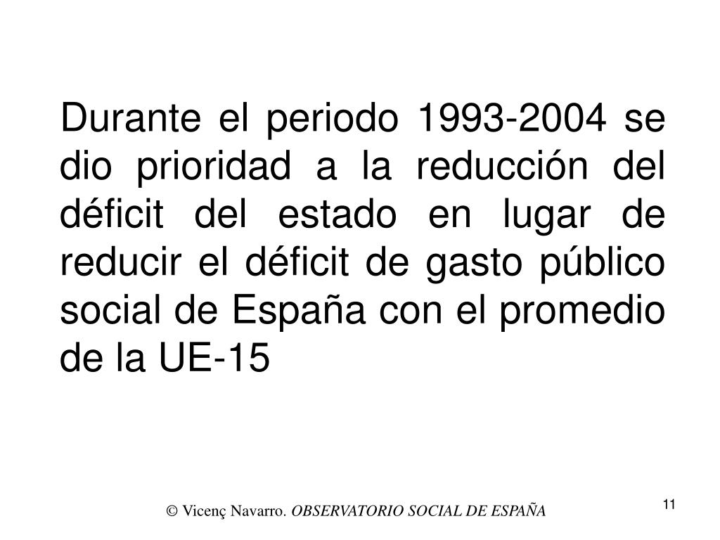 Durante el periodo 1993-2004 se dio prioridad a la reducción del déficit del estado en lugar de reducir el déficit de gasto público social de España con el promedio de la UE-15 © Vicenç Navarro. OBSERVATORIO SOCIAL DE ESPAÑA