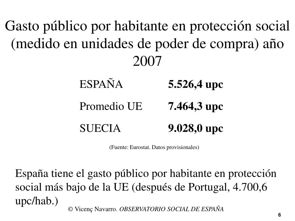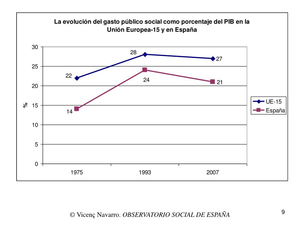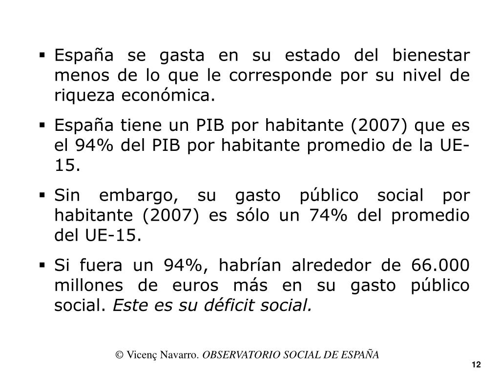 Déficit del gasto público social, en unidades de poder de compra El déficit del gasto público social de España respecto a la UE-15 aumenta desde el año 1995 hasta 2001 y comienza a disminuir en el 2004, aunque en el 2007 todavía es mayor al que existía en 1995. © Vicenç Navarro. OBSERVATORIO SOCIAL DE ESPAÑA