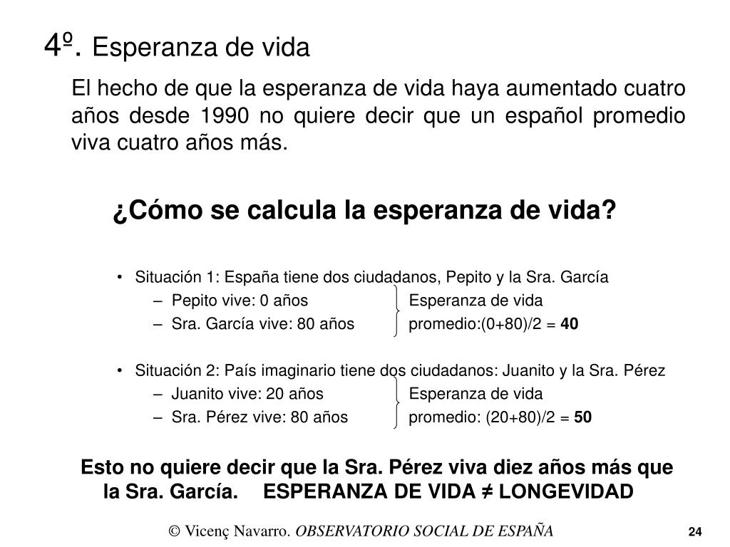 4º. Esperanza de vida El hecho de que la esperanza de vida haya aumentado cuatro años desde 1990 no quiere decir que un español promedio viva cuatro años más. ¿Cómo se calcula la esperanza de vida? • Situación 1: España tiene dos ciudadanos, Pepito y la Sra. García • Pepito vive: 0 años Esperanza de vida • Sra. García vive: 80 años promedio:(0+80)/2 = 40 • Situación 2: País imaginario tiene dos ciudadanos: Juanito y la Sra. Pérez • Juanito vive: 20 años Esperanza de vida • Sra. Pérez vive: 80 años promedio: (20+80)/2 = 50 Esto no quiere decir que la Sra. Pérez viva diez años más que la Sra. García. ESPERANZA DE VIDA ≠ LONGEVIDAD © Vicenç Navarro. OBSERVATORIO SOCIAL DE ESPAÑA 24