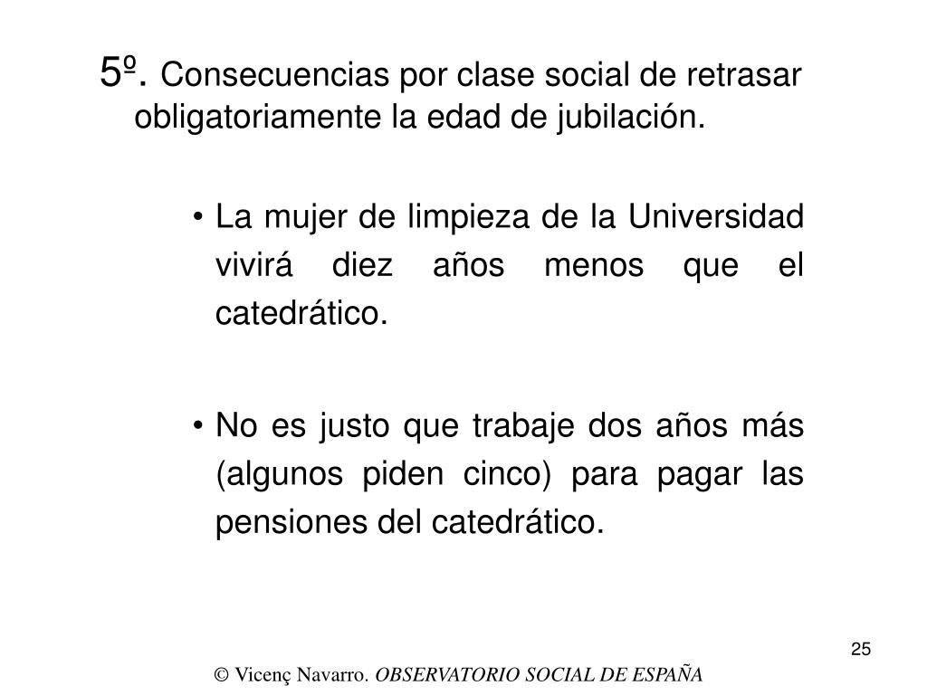 5º. Consecuencias por clase social de retrasar obligatoriamente la edad de jubilación. • La mujer de limpieza de la Universidad vivirá diez años menos que el catedrático. • No es justo que trabaje dos años más (algunos piden cinco) para pagar las pensiones del catedrático. © Vicenç Navarro. OBSERVATORIO SOCIAL DE ESPAÑA