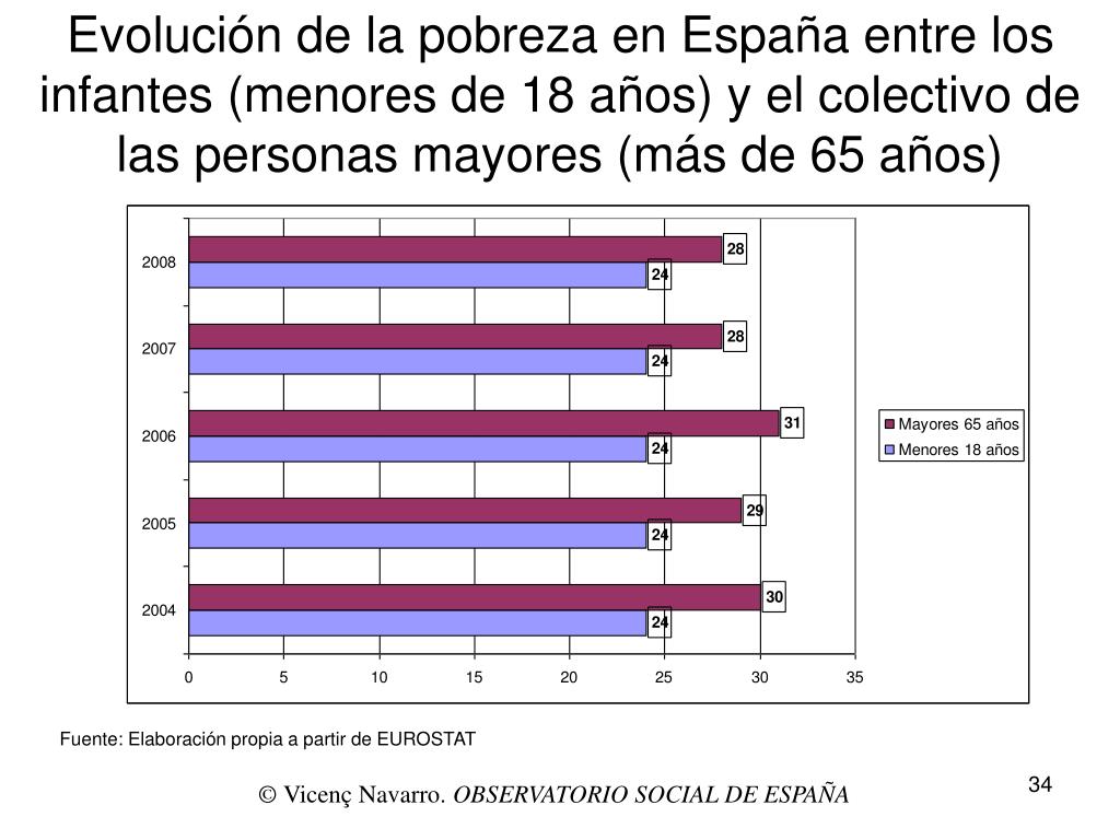 Evolución de la pobreza en España entre los infantes (menores de 18 años) y el colectivo de las personas mayores (más de 65 años) Fuente: Elaboración propia a partir de EUROSTAT © Vicenç Navarro. OBSERVATORIO SOCIAL DE ESPAÑA