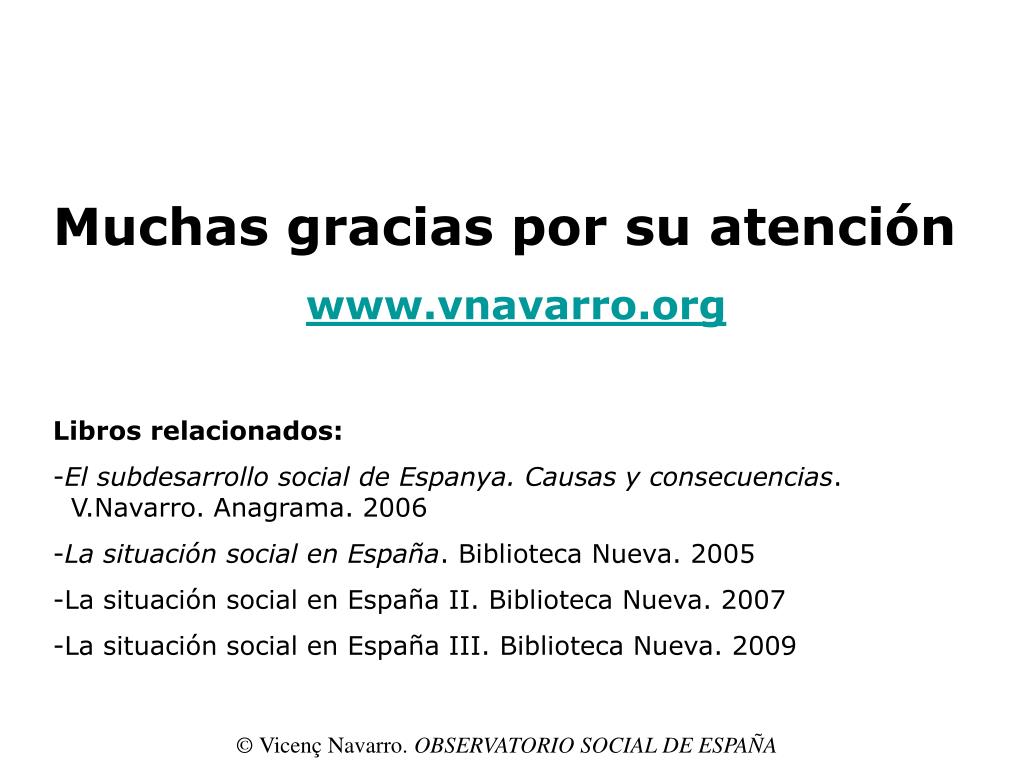 Muchas gracias por su atención • www.vnavarro.org • Libros relacionados: • El subdesarrollo social de Espanya. Causas y consecuencias. V.Navarro. Anagrama. 2006 • La situación social en España. Biblioteca Nueva. 2005 • La situación social en España II. Biblioteca Nueva. 2007 • La situación social en España III. Biblioteca Nueva. 2009 © Vicenç Navarro. OBSERVATORIO SOCIAL DE ESPAÑA
