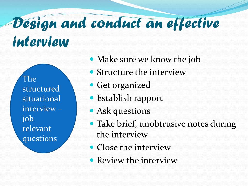 Design and conduct an effective interview • Make sure we know the job • Structure the interview • Get organized • Establish rapport • Ask questions • Take brief, unobtrusive notes during the interview • Close the interview • Review the interview The structured situational interview – job relevant questions