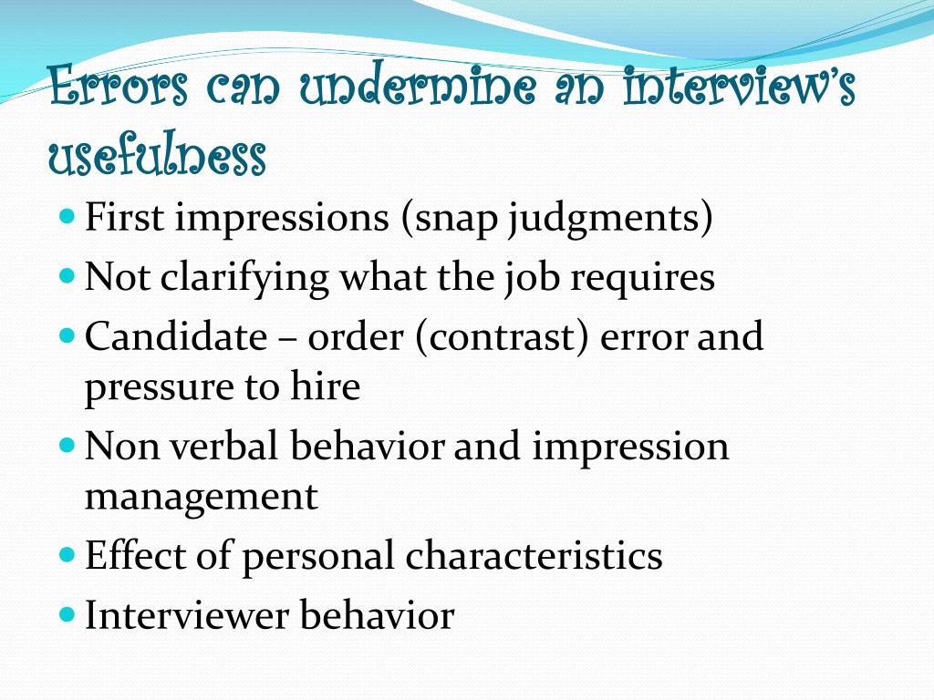 Errors can undermine an interview’s usefulness • First impressions (snap judgments) • Not clarifying what the job requires • Candidate – order (contrast) error and pressure to hire • Non verbal behavior and impression management • Effect of personal characteristics • Interviewer behavior