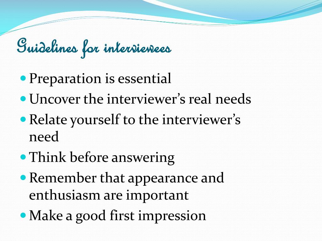 Guidelines for interviewees • Preparation is essential • Uncover the interviewer’s real needs • Relate yourself to the interviewer’s need • Think before answering • Remember that appearance and enthusiasm are important • Make a good first impression