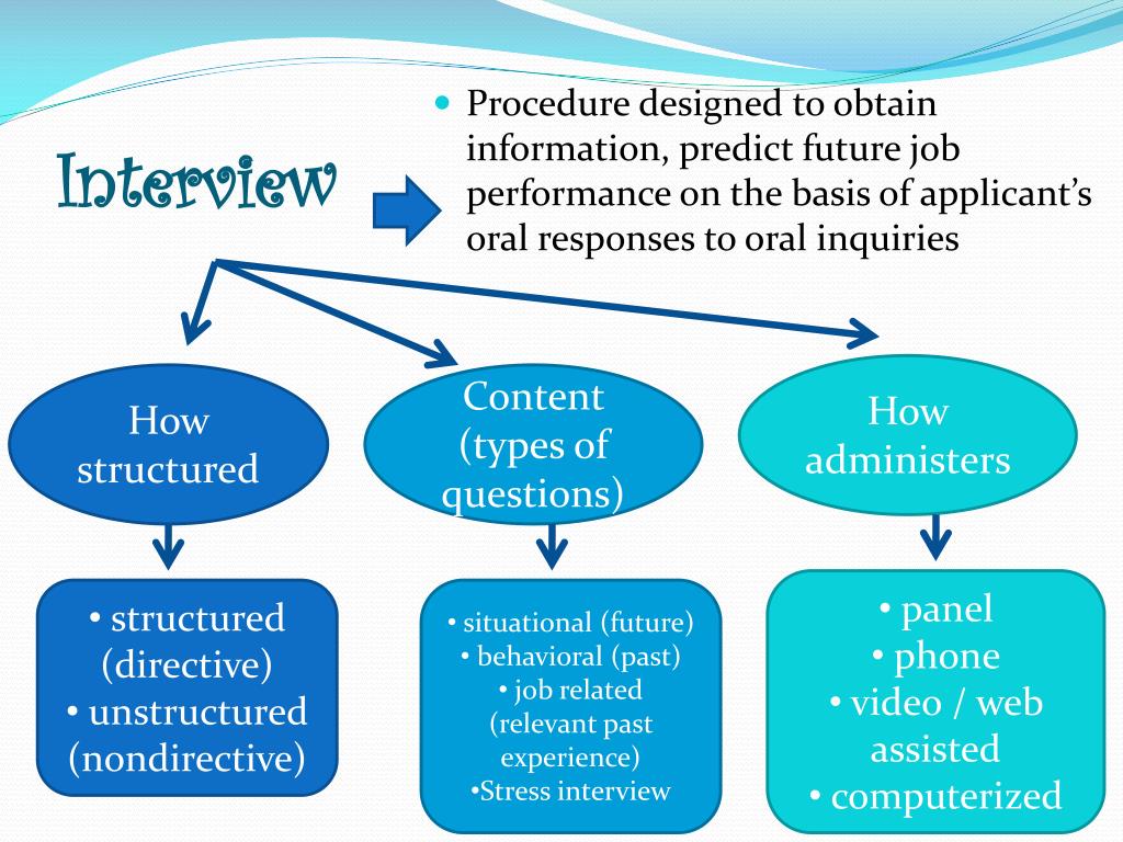 Interview • Procedure designed to obtain information, predict future job performance on the basis of applicant’s oral responses to oral inquiries How administers How structured Content (types of questions) • panel • phone • video / web assisted • computerized • structured (directive) • unstructured (nondirective) • situational (future) • behavioral (past) • job related (relevant past experience) • Stress interview