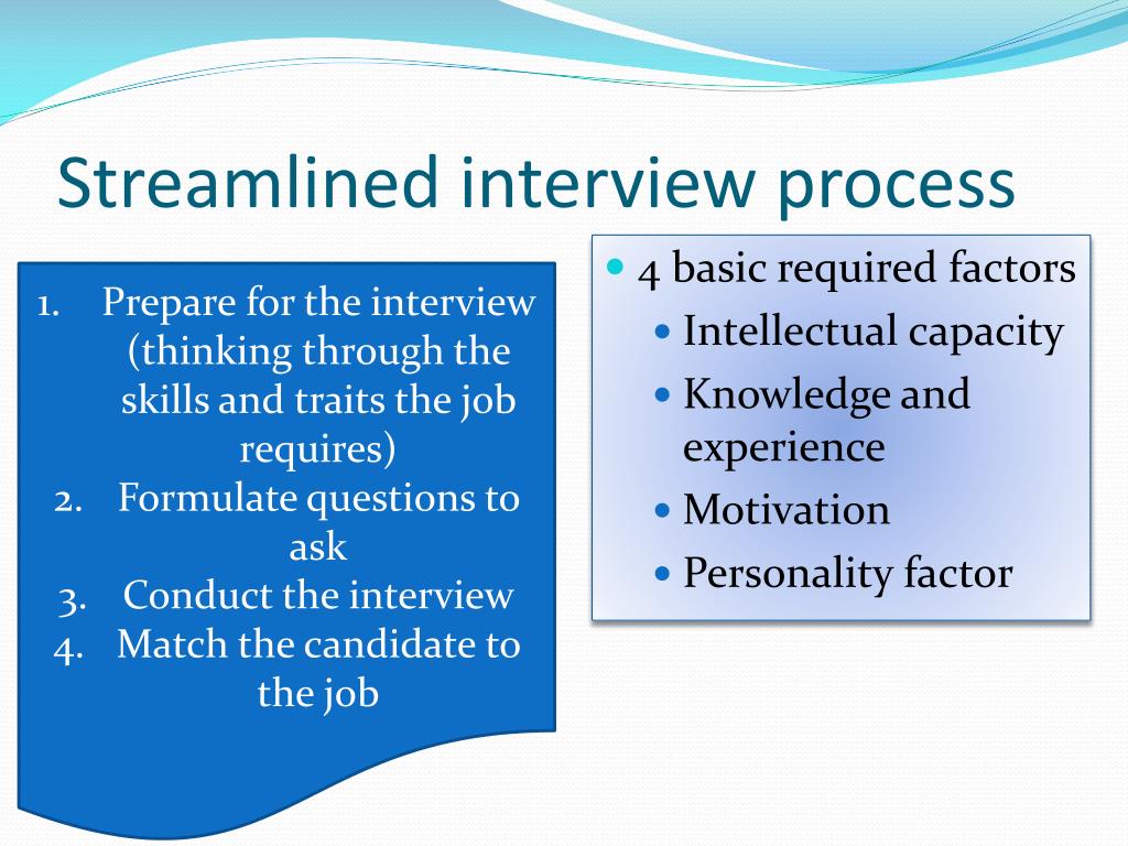 Streamlined interview process • 4 basic required factors • Intellectual capacity • Knowledge and experience • Motivation • Personality factor Prepare for the interview (thinking through the skills and traits the job requires) Formulate questions to ask Conduct the interview Match the candidate to the job