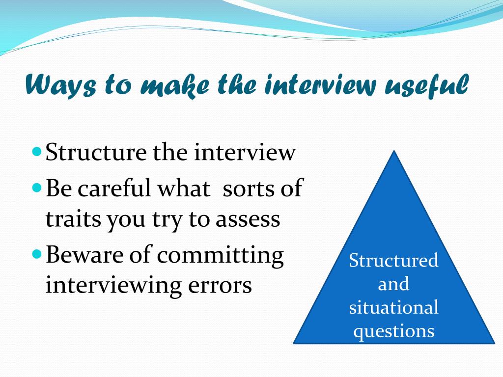 Ways to make the interview useful • Structure the interview • Be careful what sorts of traits you try to assess • Beware of committing interviewing errors Structured and situational questions