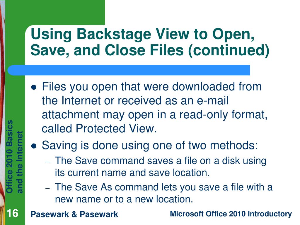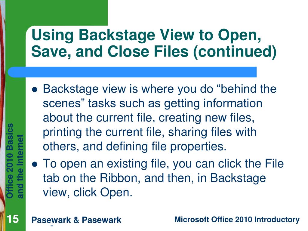 Backstage view is where you do “behind the scenes” tasks such as getting information about the current file, creating new files, printing the current file, sharing files with others, and defining file properties. To open an existing file, you can click the File tab on the Ribbon, and then, in Backstage view, click Open. - Using Backstage View to Open, Save, and Close Files (continued) 15 15