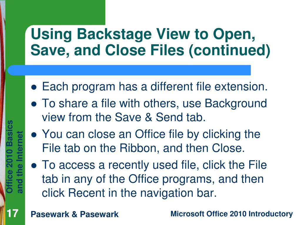 Each program has a different file extension. To share a file with others, use Background view from the Save & Send tab. You can close an Office file by clicking the File tab on the Ribbon, and then Close. To access a recently used file, click the File tab in any of the Office programs, and then click Recent in the navigation bar. Using Backstage View to Open, Save, and Close Files (continued) 17 17