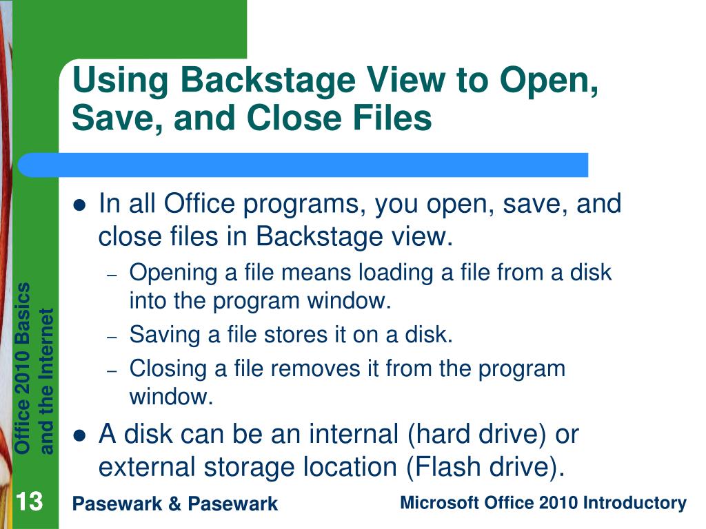 In all Office programs, you open, save, and close files in Backstage view. Opening a file means loading a file from a disk into the program window. Saving a file stores it on a disk. Closing a file removes it from the program window. A disk can be an internal (hard drive) or external storage location (Flash drive). Using Backstage View to Open, Save, and Close Files 13 13